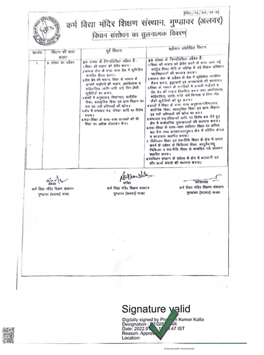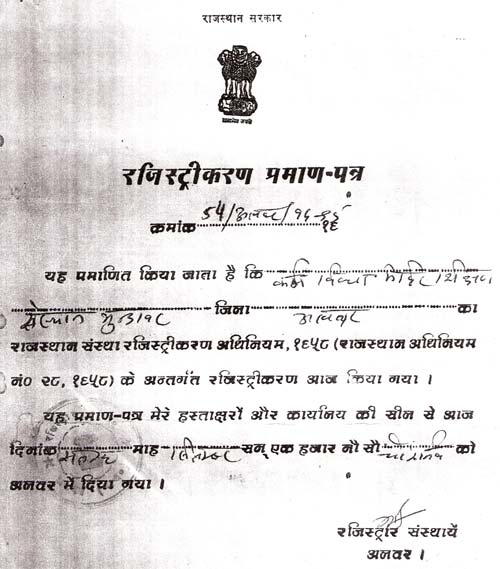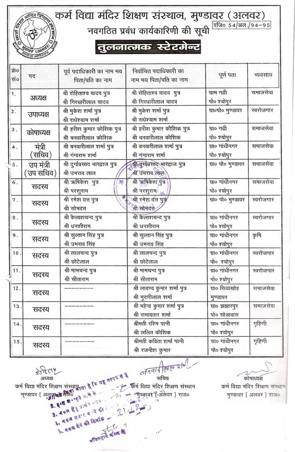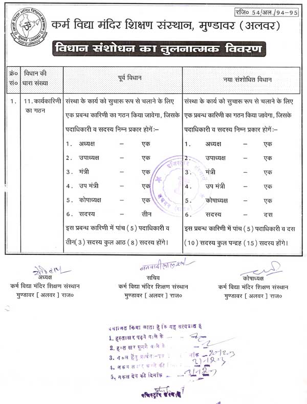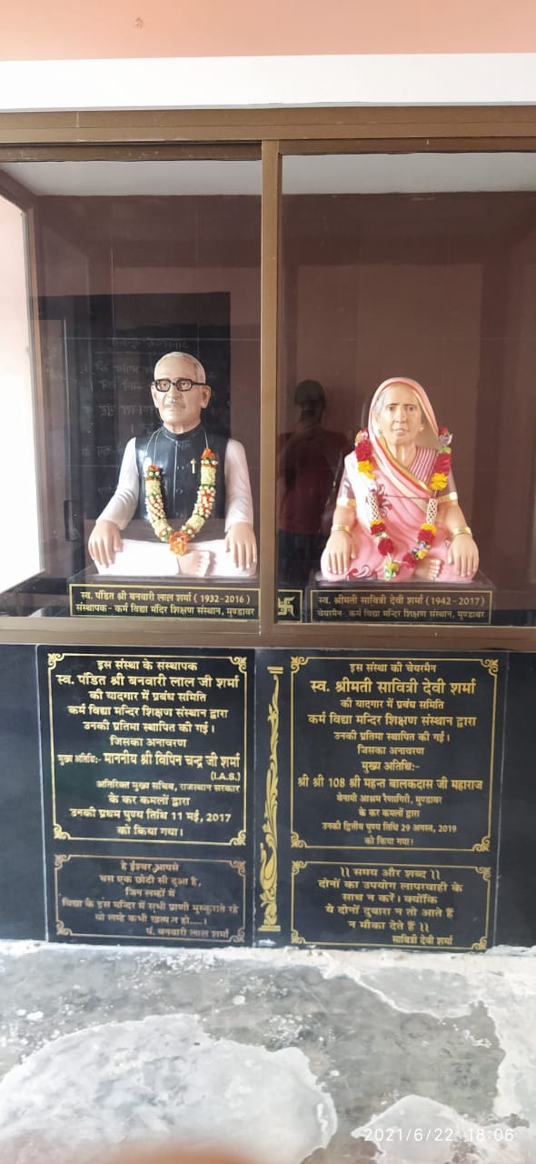 Karm Vidhya Mandir Shikshan Sansthan Shyopur Choraha, Mundawar is organised by Karm Vidhya Mandir Shikshan Sansthan, Mundawar (Alwar). This Society was constituted and registered on 1994-95 and registration number is 54/Alwar/1994-95, with a pious objective of Educational, Social & Economical development.