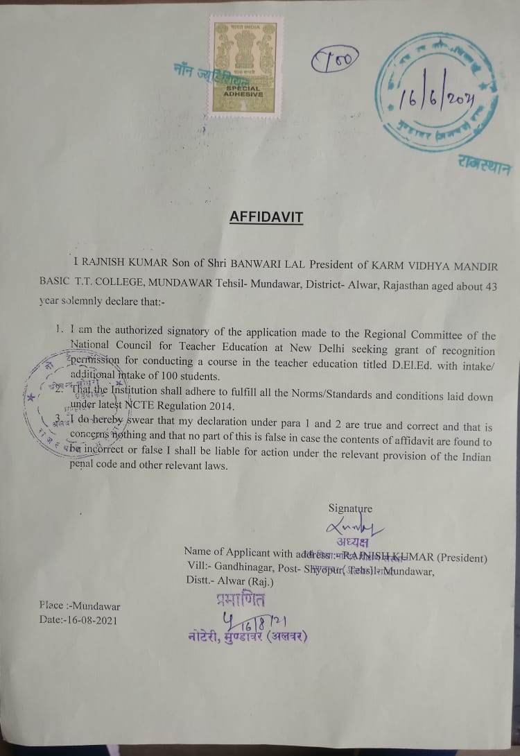 Karm Vidhya Mandir Shikshan Sansthan Shyopur Choraha, Mundawar (Alwar) is affiliated by Raj Rishi Bhartrihari Matsya University, Alwar and N.C.T.E. This College was established on 17 September 2008 and NCTE Number is F-NRC/NCTE/RJ-1655/2008 vide letter number 62629-635 dated 17-09-2008 of recognition order by NCTE.